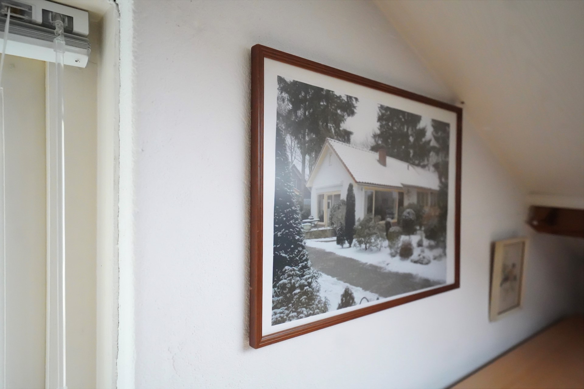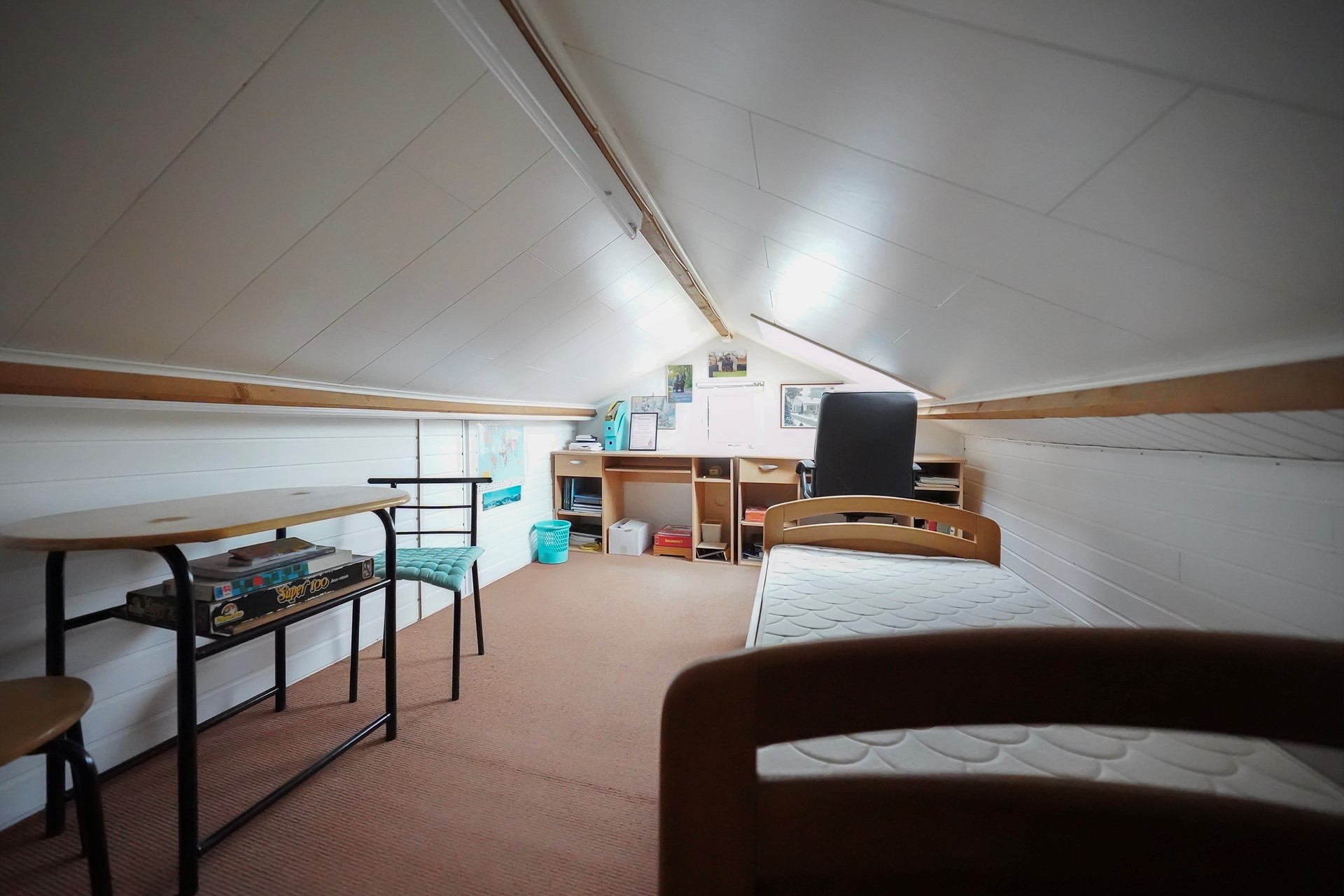 Ook voor eventuele logees is er een ruimte! Via een stevige vlizotrap is de bergzolder te bereiken. Deze ruimte heeft ook geen stahoogte maar is wel voorzien van een raam en dus van daglicht en ventilatie. Hier staat nu ook een bed zoals u op de foto’s wel kunt zien.