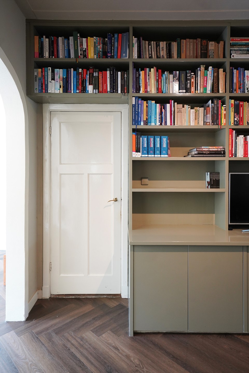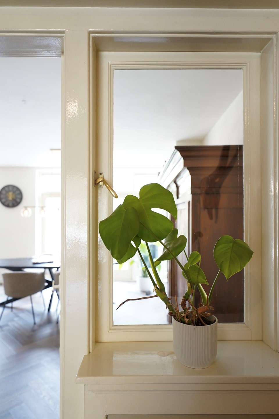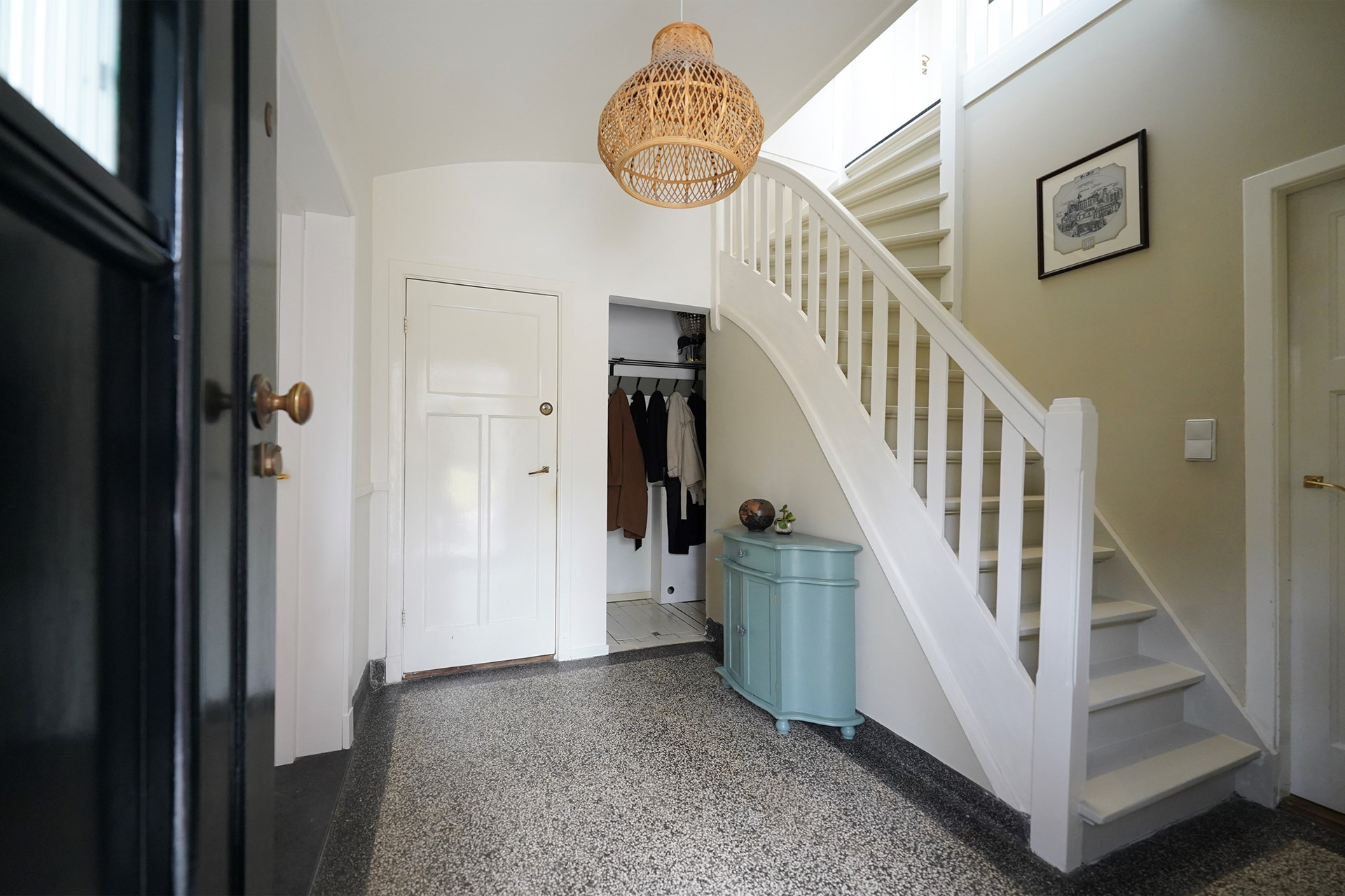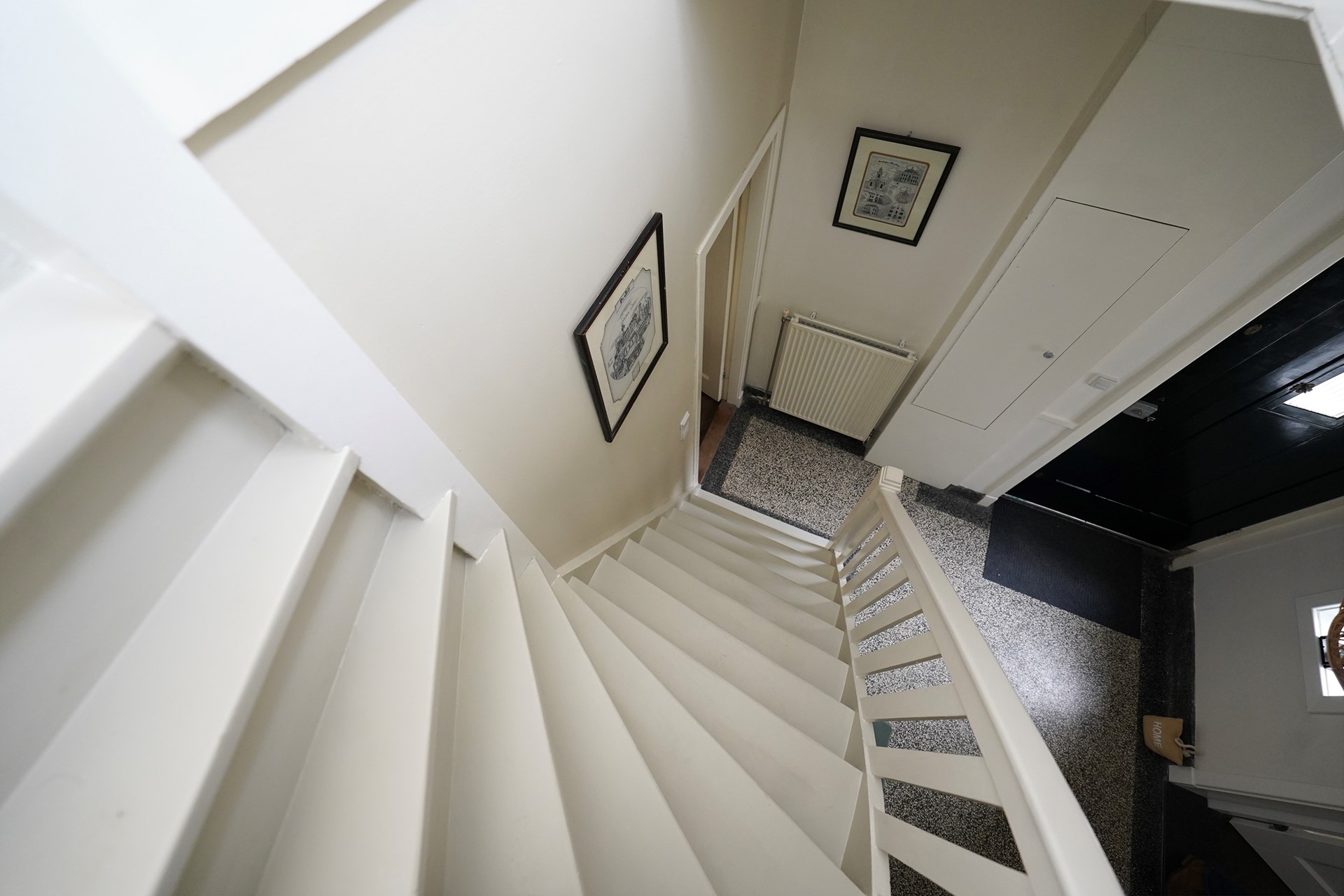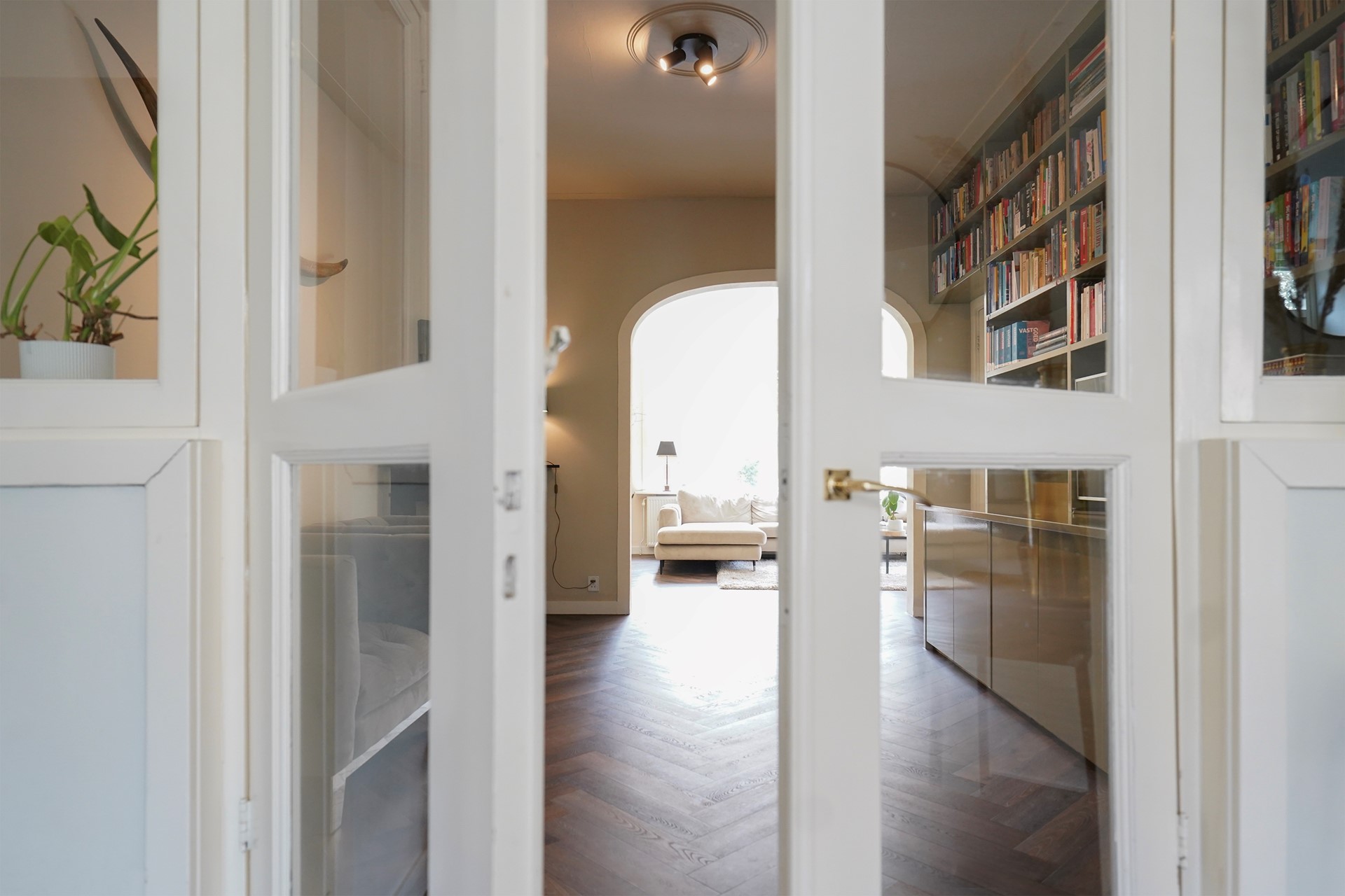 Via de hal met karakteristieke granito vloer betreedt u de sfeervolle living. Dankzij het grote raam aan de voorzijde geniet u hier van veel natuurlijk licht en een fraai, groen uitzicht op de voortuin en de rustige parallelweg. De aanwezige bibliotheek vormt een charmante plek voor uw boeken. Via de karakteristieke deuren komt u in de woonkeuken. Deze ruimte biedt een prachtig uitzicht op de bostuin en staat in directe verbinding met het terras via dubbele openslaande deuren, een heerlijke plek om binnen en buiten te laten samenkomen. De keuken is uitgerust met een Bosch koelkast en vaatwasser, en een stijlvol SMEG fornuis met oven en inductiekookplaat (2025). Een echte leefkeuken, de centrale plek in huis.